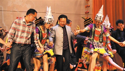 ◀自治区民委主任卢献匾(中)与演员共舞联欢。