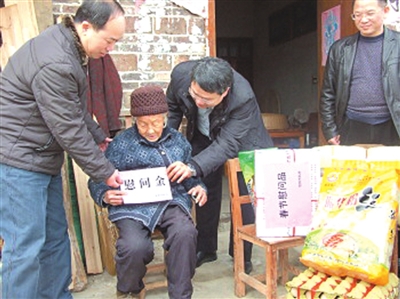 “感谢党和政府没有忘记我这个老人家啊!”接过慰问团送来的棉被、食物和慰问金,现年97岁的王召妹不停地说道。