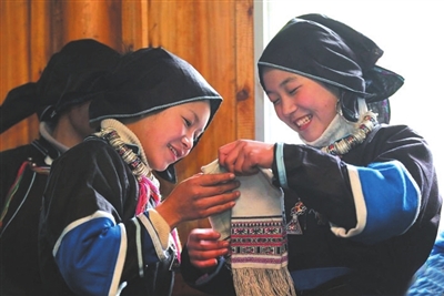 ▲15时10分,上岩村精心梳妆打扮后的姑娘们等待邻村来接。杨伶俐(右)与阿妹比起了谁绣制的手帕漂亮。