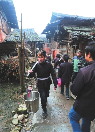 ▲上午,村寨的小伙子组成“讨酒”队,挨家到邻村姑娘家中“讨酒”。