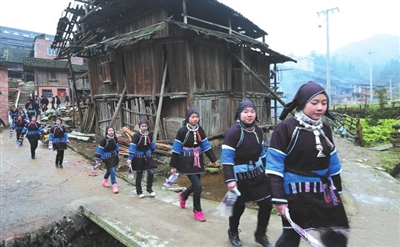 ▲14时10分许,上岩村的姑娘穿过寨子前往坪寨参加活动,接受小伙子的考察。
