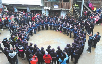 ▲16时20分,坪寨村的长者吹起自制芦笙,欢迎上岩村的姑娘们。