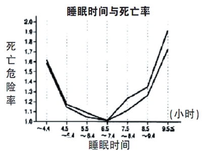 近日,一张“睡眠时间”对阵“死亡危险率”(见下图)的图表在微博上被疯转。图表显示,睡眠时间在6.5—7.4小时之间,死亡率最低;少于4.4小时或高于9.5小时,死亡危险率会翻倍增高。医学专家表示,该图表有一定合理性,掌握睡眠时间有利于长寿。
