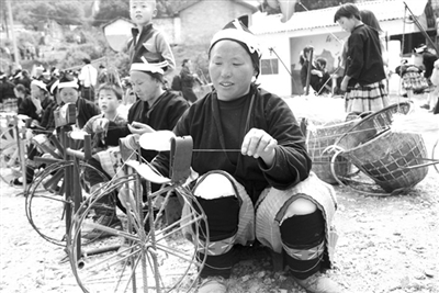 2月23日,是南丹县里湖瑶族乡里湖街圩日,恰是农历正月十四,也是白裤瑶年的最后一个年街,称之为年街节。来自里湖、八圩两个瑶族乡的白裤瑶同胞不约而同聚集乡政府所在地的里湖街,通过展示原汁原味、多姿多彩的服饰文化、刺绣文化、陀螺文化等本民族的民俗文化,来共同庆贺2013年春节期间的最后一个年街。图为几名白裤瑶妇女在