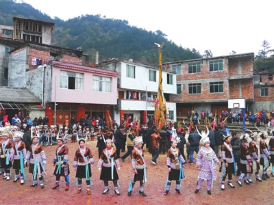 ▲头戴银饰、身穿五颜六色民族服饰的苗家妇女,围着芦笙队,跳起踩堂舞,舞蹈动作与芦笙乐曲节奏协调统一。
