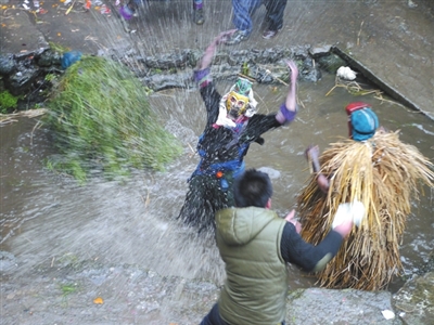 ▲“芒蒿”们跳进水塘里搅动着水或将水泼向抢钱的人们,试图阻止他们抢钱。