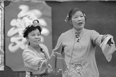 3月15日,农历二月初四,是融安县大将镇一年一度的传统会期,当地各村屯文艺队搭台唱戏,为群众表演自编自演的文场、彩调等非物质文化遗产剧目,宣传各项惠民政策,为当地各族群众献上一道文化大餐。图为两名农民演员在表演经典彩调剧目《王三打鸟》。(谭凯兴 摄)
