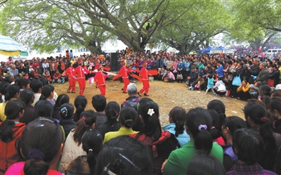 ▶游人在柳城县凤山镇开山寺古榕树林下观看文艺演出。