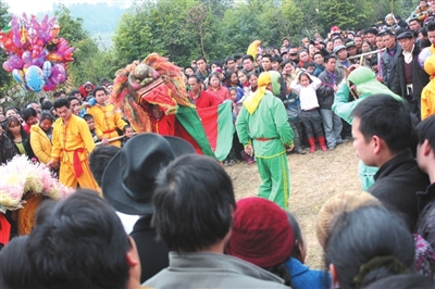 如今,每到坡日这天清晨,通往古龙的大道小道上,车鸣马嘶,行人川流不息。百里团转的元宝山下、美丽的贝江河两岸,各族群众身着盛装,肩扛芦笙,手牵骏马,或手提心爱的画眉鸟笼,或肩挑货担,从四面八方汇集到这六甲河畔的好地方——古龙坡。