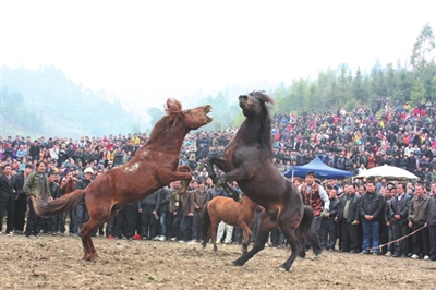 古龙坡会斗马是人们青睐的项目之一。斗马场上一名胆大心细的中年男子将一匹母马牵入场内,另由两位马主牵两匹公马与母马“相识”,片刻,马主松开缰绳,为争夺异性的两匹公马顿时厮斗起来。一时间,场上沙泥翻滚,尘土飞扬,两匹公马时而腾空弹踢,寻机啮咬对方喉、眼、唇等要害部位;时而高扬双蹄,猛踢敌方;时而双双倒卧,绞作一团,专找敌方关节、腹肌啃咬;时而奋蹄疾奔,你追我赶。斗到精彩处,观众狂呼喝彩,敲锣击鼓,助威声援,激烈紧张气氛弥漫整个场面。斗马按复赛、决赛进行。结束时,人们给获胜的雄马披红挂绿,吹笙放炮表示祝贺,马主手捧奖品喜气洋洋。