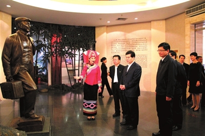 ▲王正伟(前排中)在自治区副主席蓝天立(右一)、自治区民委主任卢献匾(左二)陪同下参观百色起义纪念馆。