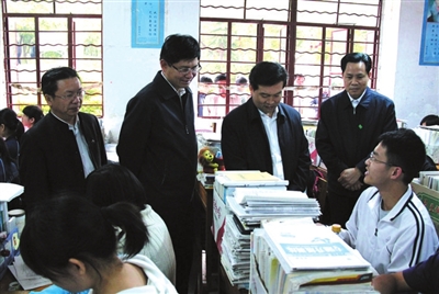 ▲王正伟在河池市都安瑶族自治县都安高中与同学们亲切交谈。