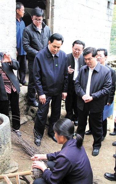 ▲王正伟在河池市都安瑶族自治县地苏乡大定村实地了解当地村民手工藤编工艺品产销情况。