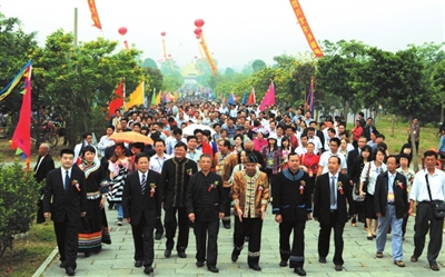 ▲参加2013年百色市布洛陀民俗文化旅游节的嘉宾在参观敢壮山景区。