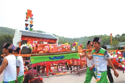 ▲扛着祭品祭拜壮族始祖布洛陀。
