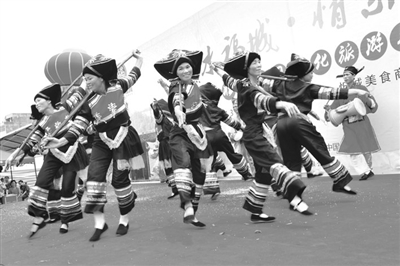 “五一”期间,忻城县举行壮乡土司文化旅游节民俗展演活动,众多城乡群众一同欣赏了具有浓郁民俗特色的舞龙、唱山歌等文艺节目。图为4月29日,该县壮族群众在旅游节活动上表演原生态舞蹈。(樊绍光 摄)