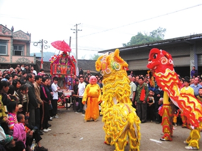 在龙州县武德乡,龙元节的民间活动特别隆重、热闹。这天,在乡政府所在地的科甲村街道上,汇集了本乡以及来自金龙、逐卜、上龙、水口、响水等乡镇的上万群众,也吸引了邻近的大新县群众前来参加。活动的重头戏是几个村民抬着大神台,由龙、狮子和麒麟在前面引路游街,祭拜各家各户,祈福禳灾。村里还举行山歌擂台赛、民族歌舞表演、拔河和球类比赛等,热闹非凡。
