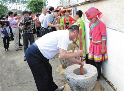 | ▲与会代表在参观庆乐小学传统农具陈列室时动手舂枫叶。 |