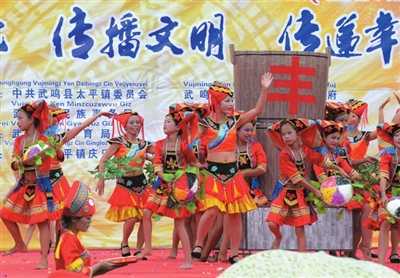 | ▶庆乐小学师生为与会代表表演壮族传统舞蹈。 |