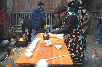 “生祭”就用活的牲畜作为祭品。“巡游”大约在上午10点30分开始,在祭司的引领下,两位壮士抬着“萨岁”神像(萨岁撑着伞)的轿子紧随其后,再后就是“萨”的子民,排成一路长长的纵队,依次由上寨到普团、江坪等周边各个侗族村落进行游行赐福活动。“熟祭”就是用熟的祭品来祭拜“萨岁”。歌舞表演活动是在“熟祭”之后在萨堂前的石坪上举行,表演队伍是由各个村寨组织的文艺表演队组成,主要节目有多耶舞、芦笙踩堂、打糍粑舞、讲款、板凳舞、捶布舞、琵琶歌等侗族传统歌舞节目。活动的高潮阶段是“百家宴”。以前祭萨活动是不吃百家宴的。近年来,随着宝赠村祭萨节知名度的不断提高,节日内容也有所改变,除了传统的祭祀祈福外,在政府的倡导下,还增加了百家宴、歌舞表演、物资交流等活动内容。