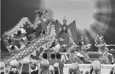 2012年11月,上林县获得“中国长寿之乡”的称号。本次旅游养生节以“生态上林、长寿福地”为主题, 将养生节与“中国长寿之乡”相结合,更加丰富和深化了民族旅游的内涵。为体现上林“生态立县、绿色发展”的理念,本次旅游养生节通过徒步登山、自行车越野赛、养生长寿专题讲座等活动倡导人们绿色、健康、环保生活,展现“百美上林、长寿上林、文化上林”的新形象。图为极具本土气息的养生节开幕式文艺表演《千龙探母》。(本报记者 韦愿娜 摄)