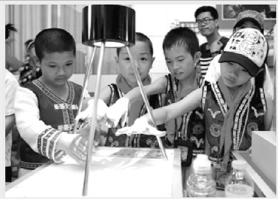 5月24日,柳州科技馆、融水苗族自治县科技局和青少年活动中心等单位联合举行“2013年全国科技活动周融水活动启动仪式暨柳州科技馆走进融水”活动,科普人员现场表演遥控飞机、汽车,发射教学实验火箭,演示盐水在不同化学物质的作用下发生不同的变化,让学生使用望远镜,了解动植物标本,制作表演飞机、火箭、风车,玩“是你是我”等活动,让来自不同学校的苗娃开了眼界。图为几名学生在玩“七彩手影”。(廖子渊 摄)