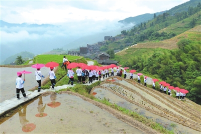 5月31日至6月1日,龙胜各族自治县龙脊梯田景区的平安壮寨举办龙脊风情画廊节,当地壮族群众在梯田上进行了壮家送亲风情展示以及牛耕、偶耕等传统农耕活动,向中外游客展现了一幅原生态的民俗风情画卷。