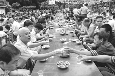7月2日,都安瑶族自治县在大兴乡花康瑶族新村举行布努瑶“祝著节”庆祝活动。瑶族同胞们与来自四面八方的客人欢聚在一起,感受独特的布努瑶礼仪,唱瑶歌跳瑶舞,开展打陀螺、斗鸡、祭祀瑶族祖先、摆长桌宴等活动,瑶胞们高举酒杯,与远方的客人把酒当歌,共话党的好政策带来的新生活。当晚,还举行文艺表演,瑶歌联唱、瑶族风情舞蹈吸引近1000多人前来观看。图为瑶族同胞们摆起长桌宴,与远方的客人把酒当歌。