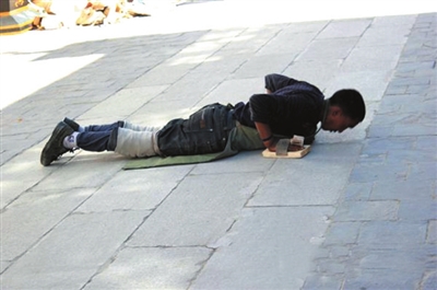 据介绍,这些青石板和一般的石板最大的区别就是,其颜色呈现灰黑色,不反光、不反热,而且吸水性好。以前,八廓街铺的都是一般的石板路面,太阳大的时候反光刺眼,走在石板路上感觉十分热,而且下雨的时候容易积水。图为专为磕长头的信众铺设的2米宽的“朝圣路”。