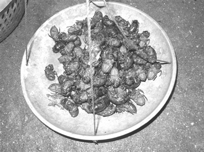 有时候母亲也会用蝉蛹来改善一下家里人的生活。蝉蛹通常的吃法是油炸,只需将蝉蛹洗去泥沙,用细盐腌渍半小时,放入油锅里炸,直到变成金黄色时就可出锅。油炸好的蝉蛹外面酥脆,里面鲜香,如果蘸上孜然、五香粉吃风味更佳。