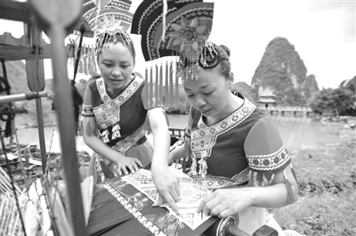 7月3日,“靖西壮锦”织锦技艺展演在靖西县新靖镇旧州村举行,靖西县壮锦厂织锦艺人现场展演了织锦绝活。“靖西壮锦”是壮族著名的民间工艺织品,早在宋代就列为中国四大名锦之一,2006年被列入国家首批非物质文化遗产保护项目。靖西壮锦纯手工编织,整个生产过程至今依然保持拉纱、梳纱、穿棕、结花板等传统工艺。图为两位艺人在切磋织锦技艺。