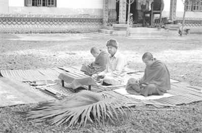 云南贝叶经被称为“刻在树叶上的傣族文化”。贝叶经,就是用铁笔在贝多罗树叶上所刻写的佛教经文,同时还融进了大量的世俗文字,涉及天文、地理、历史、医学、教育、政治、文学等诸多方面,被看做是傣族文化的百科全书。西双版纳勐景来村为了更好地保存和传承傣族文化,特意请长者在村中的寺庙传授贝叶经的刻写制作。图为村里的小和尚正在学习刻写贝叶经。