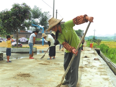 今年40多岁的队长谭清秀说,近段时间正是农忙收割季节,收割机来回走动难免给道路带来泥土和杂草,水沟里也堵满了稻草,村庄卫生需要及时清理,她们上午8时就出门打扫村道、清理水沟。说完她就拿起扫把走向村道上,与其他队员一起打扫卫生。