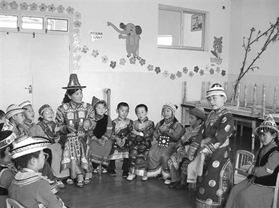 甘肃省肃南裕固族自治县是我国人口较少民族裕固族的主要聚居区。裕固族因其特殊的地理位置和悠久的历史,经过多次民族大迁徙、大融合,形成了本民族独具特色、丰富多彩的民族风情和文化。肃南县始终重视文化遗产保护工作,采取有力措施开展文化遗产保护工作,取得了明显成效。图为肃南县幼儿园教师为孩子教授裕固族语言。