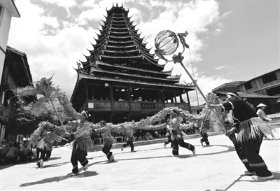 连日来,龙胜各族自治县平等乡广南村草龙草狮保护和传承人在忙于筹备申报国家级非物质文化遗产。源于清朝道光年间的广南草龙,以复杂精致的编织工艺、独特精妙的舞艺得以世代相传。图为7月28日,该村在申报国家级“非遗”启动仪式上进行舞龙舞狮展演活动。(石农兵 蒲庆峰 摄)