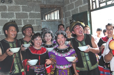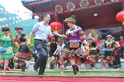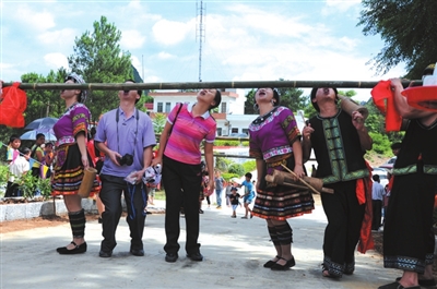 这一天,迎宾门前,瑶哥瑶妹们用灌满玉米酒的竹竿摆出一个迎客方阵,展示瑶乡人民的热情奔放。宾客到来时,瑶哥瑶妹们敲起竹筒,唱起迎宾歌,引导来客穿过竹竿。每条竹竿长约四米,分别由两人扛着,竹节被穿成几个小洞灌入玉米酒,客人每过一条竹竿,扛着的人就把竹竿倾斜,酒液便顺着竹竿上的小洞流出,客人就得张口喝下,如此要连过三关。奇特的形式让每一位来宾惊喜不已,三关下来,有的宾客的脸已被美酒熏红。