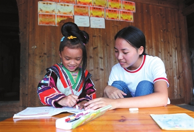 图为一名大学生入户为瑶族留守儿童辅导功课。