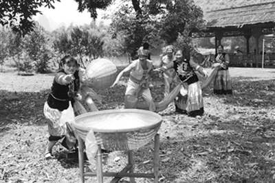 七夕节是我国传统节日中最具浪漫色彩的节日,也被认为是“中国情人节”。8月13日,罗城仫佬族自治县在米椎林度假村举办“甜蜜七夕·浪漫相约”情人节活动,抢同心粽、民间彩调、民族体育竞技、唱山歌等活动吸引众多游客参与。图为游客在参加仫佬竹球比赛。(韦如代 摄)