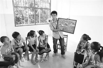 8月20日,广西卫生职业技术学院等院校的10多名大学生到融水苗族自治县香粉乡九都村苗寨开展看望留守儿童活动,为苗寨留守儿童送去生活用品和学习用具,还与留守儿童一起玩游戏、学画画。图为一名大学生在指导苗寨里的留守儿童学画画。