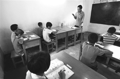 古砦仫佬族乡大岩垌村属自治区级贫困村,该村地处偏远的大石山区,生活条件十分艰苦。大岩垌教学点原来只有1名教师和一至二年级的11名学生。随着农村外出务工人员的增多,农村地区生源不断流失。新学期开学,全村只剩9名留守儿童在教学点就读,其中一年级预备班(学前班)2人,一年级4人,二年级3人。他们年龄最小的只有5岁,最大的9岁。如今,当地一名教师仍然坚守教学点,使这个“微小学”得以保留,也为山区低年级学生就近入学提供了便利。图为孩子们正在教室里认真听课。(邓克轶 摄)