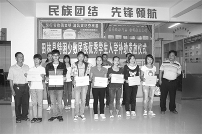 为了做好特困少数民族优秀学生入学专项经费补助工作,田林县民族局认真按照自治区及百色市的相关文件要求,对要求受助的学生进行严格把关、认真筛选,经民族局与相关部门协调与审定后向社会公式。9月6日,民族局将补助经费全部发放到特困少数民族学生手中,其中大学生7名、高中生7名, 大学生每人3000元,高中生每人1000元,共计28000元。图为特困少数民族学生领到入学专项经费。(田林县民族局 黄碧艳 黄莉峰 摄)