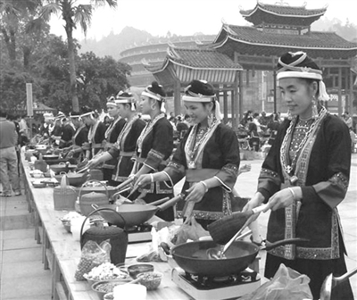 姑娘们羞涩地笑了,赶紧在碗上放上一双筷子,这时吃油茶才正式开始。