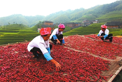 又是一年收摘红辣椒的季节,龙胜各族自治县和平乡马海村壮族群众趁着晴好天气抓紧收摘红辣椒晾晒,红艳艳的辣椒晒场与梯田、村落交相辉映,组成一幅亮丽的秋色图。据村民介绍,当地所产龙脊辣椒深受顾客青睐,干辣椒可以卖到每公斤40元的好价钱。