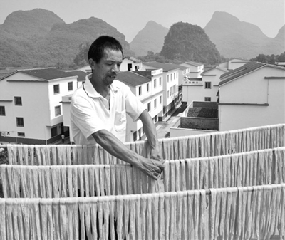 2010年,水库移民黄祥俊乔迁临桂县东计岭水库移民新村新居后,在国家移民政策的扶持下,凭借着20多年的传统手工制作腐竹的手艺,在家里办起一个传统腐竹加工作坊。由于选用当地上乘的黄豆为唯一原料,并严格按照传统手工工艺流程进行生产,他每年生产的2吨多纯手工生产腐竹全部销往法国,每年纯收入达4万多元。图为9月13日,黄祥俊在自家的新房屋顶用阳光晾晒腐竹。