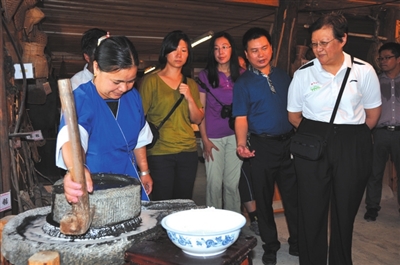 范徐丽泰还走进农家旅馆和侗族民俗工艺馆,她反复叮嘱:“侗寨楼桥奇观、田园风光和缤纷风情是三江旅游的关键卖点,发展旅游必须立足生态、规范管理,加强侗族人文与楼桥建筑原真性的保护力度,关键在景、重点在人,要极力避免走进‘铜臭味’旅游的怪圈!”在侗族民俗工艺馆内,琳琅满目的“侗家宝贝”让她大开眼界,她对馆主杨似玉说,你是侗族建筑工艺的“活国宝”,你要勤出杰作、多教徒弟,让侗族文化誉满全球,让绝技代代相传!