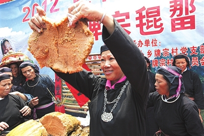 在逐卜乡牌宗村的昆那节上,最吸引人的是30多斤重的大粽子。大粽子用25斤糯米做成,7、8个人花了几个小时才包好,包好后煮三天三夜才煮熟。为什么要做那么大的粽子呢?相传,古时村里有一个姑娘长得貌美如花,登门提亲的人几乎踏破了门槛。姑娘的父母说,谁对姑娘真心实意,让她过上红火的日子,给姑娘父母足够的面子,就让姑娘嫁给他。村里有个小伙子就想出妙计,用25斤糯米做了一个大粽子,煮熟后抬到姑娘家。小伙子打开粽子,用刀切成一块块,他对姑娘父母说:“粽子里不放馅,表示我对姑娘真心实意,粽子里面是红色,表示我能让姑娘过上红火日子,切开的粽子块比脸庞大,表示我给姑娘父母足够大的面子了。”姑娘父母听了满心欢喜,就把姑娘嫁给了他。从此,这里的小伙向姑娘求婚,都喜欢做大粽子送到姑娘家。在今年的昆那节上,我们有幸品尝了牌宗村美味的大粽子,心里感到广大村民在党的富民政策指引下,日子越来越红火,在世人面前的面子也越来越大了。