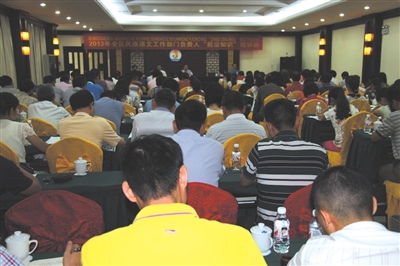 本报讯(记者 唐 龙 文/图)为进一步提高全区民族语文工作部门负责人对党和国家民族语文政策的理解和执行能力,促进民族语文工作科学发展,9月24至27日,自治区民语委在防城港举办2013年全区民族语文工作部门负责人“前沿知识”培训班。自治区民委、民语委主任卢献匾做开班讲座。培训班开班仪式及讲座分别由自治区民语委副主任杨启标、王泉忠主持。
