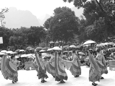 近日,大新县恩城乡陆榜村苏屯举行了“美丽广西·清洁乡村”暨该屯‘侬垌’节文艺演出,来自该乡和周边兄弟乡镇的文艺爱好者共500多人同台献技,演员们通过自编自演把“美丽广西·清洁乡村”活动融入其中,演出内容有小品、舞蹈、独唱、山歌、三句半等43个节目,其中小品《三个老人捡垃圾》将演出推向了高潮。精彩的演出吸引了上万名观众前来观看。图为文艺队表演现场。(林丽平 摄)