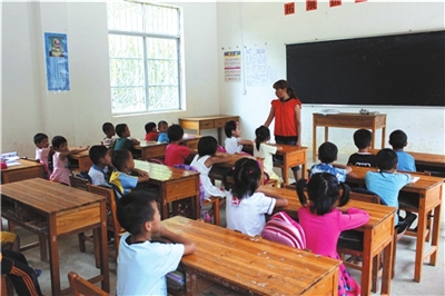 如今的教学点里已经有了28名学生,不大的教室里坐满了学生,分别是一年级(包括学前班)和二年级的学生。为了方便教学和管理,陈永花把所有学生集中在一间教室里进行复式教学,分左右两边坐。给一年级上课的时候,同时给二年级布置作业,给这边讲课还要注意那边的动静。如此,上完一个年级的课又换上另一个年级的,孩子们有休息的时间,陈永花却是连轴转。