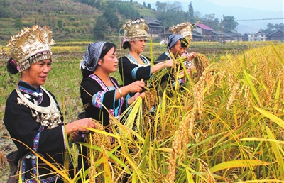 10月16日是世界粮食日,龙胜各族自治县平等乡广南村的侗族群众抢抓晴好天气收红糯谷,田间地头呈现一派繁忙景象。据悉,平等、乐江两个乡镇是龙胜红糯谷的主要产地,该县通过引导群众成立红糯种植合作社,严格按照绿色食品要求规范种植红糯7000多亩,实现了产业化、绿色化、品牌化目标。